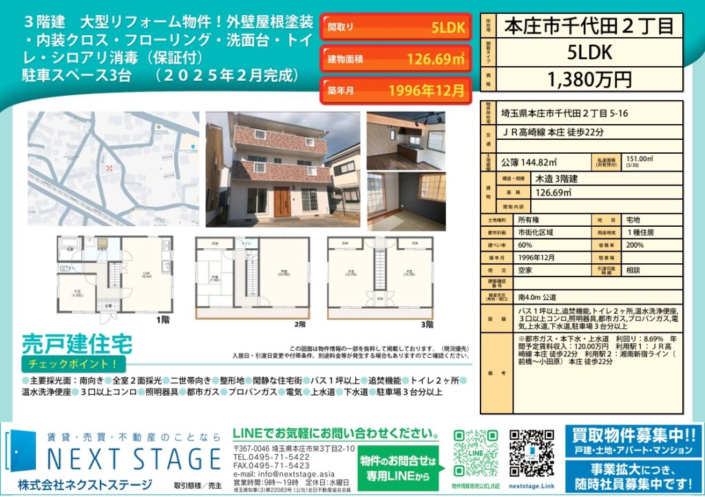 本庄市千代田2丁目 3階建て大型リフォーム中古住宅